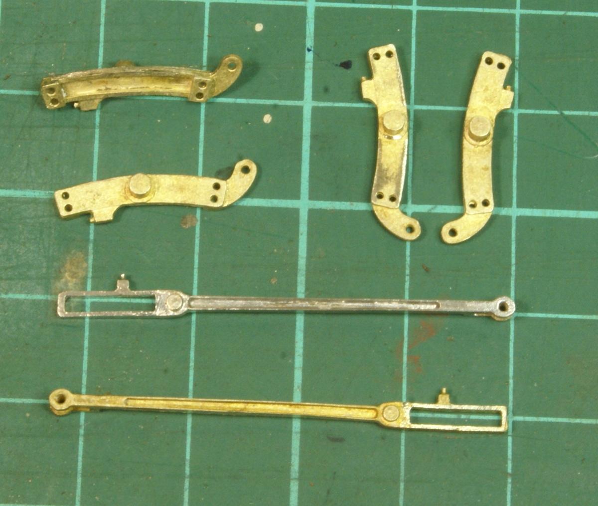 In the instructions the motion building starts with the expansion link and radius arm so these are the bits supplied. They are all brass castings, two halves for the expansion link and cast radius arm. The top one showing my effort to get the valve gear the right colour, i.e. steel. The brass castings are far too yellow for me so I’m experimenting with tinning all the castings to give me that steel colour. I’ll just have to be very careful soldering the joints!!