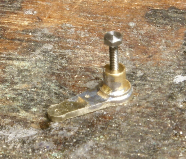 The drilling jig was then clamped to a piece of 10 thou’ nickel sheet but this time only the 4 bolt holes and the return pivot was drilled. The jig was then removed and the 4 bolt holes were drilled larger (No.53) to clear the Scale Hardware bolts. This was only cut out roughly to shape then it was located and soldered to the thicker nickel sheet, with the scale hardware fitted. The thin nickel sheet was then filed down to match the main return crank piece.